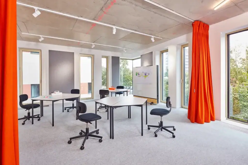 Hier findet Teamarbeit statt: Workshops, hybride Meetings oder agile Sprints. Akustikelemente, modulare Einrichtung und Community-Tables bilden die Basis. Digitale Raumbuchung, Präsentationstechnik und Collaboration-Tools machen produktives Arbeiten einfach, auch standortübergreifend.